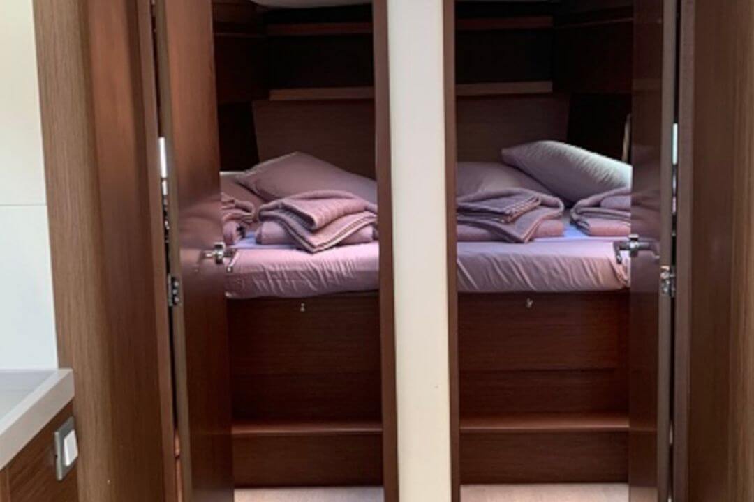 Oceanis 46.1 oferuje 4 kabiny oraz miejsca do spania dla maksymalnie 10 osób (z wykorzystaniem rozkładanego stołu w mesie). Dużą zaletą tego modelu są 4 łazienki z elektrycznymi toaletami – rozwiązanie rzadko spotykane w tej klasie długości, a bardzo praktyczne przy większej załodze.