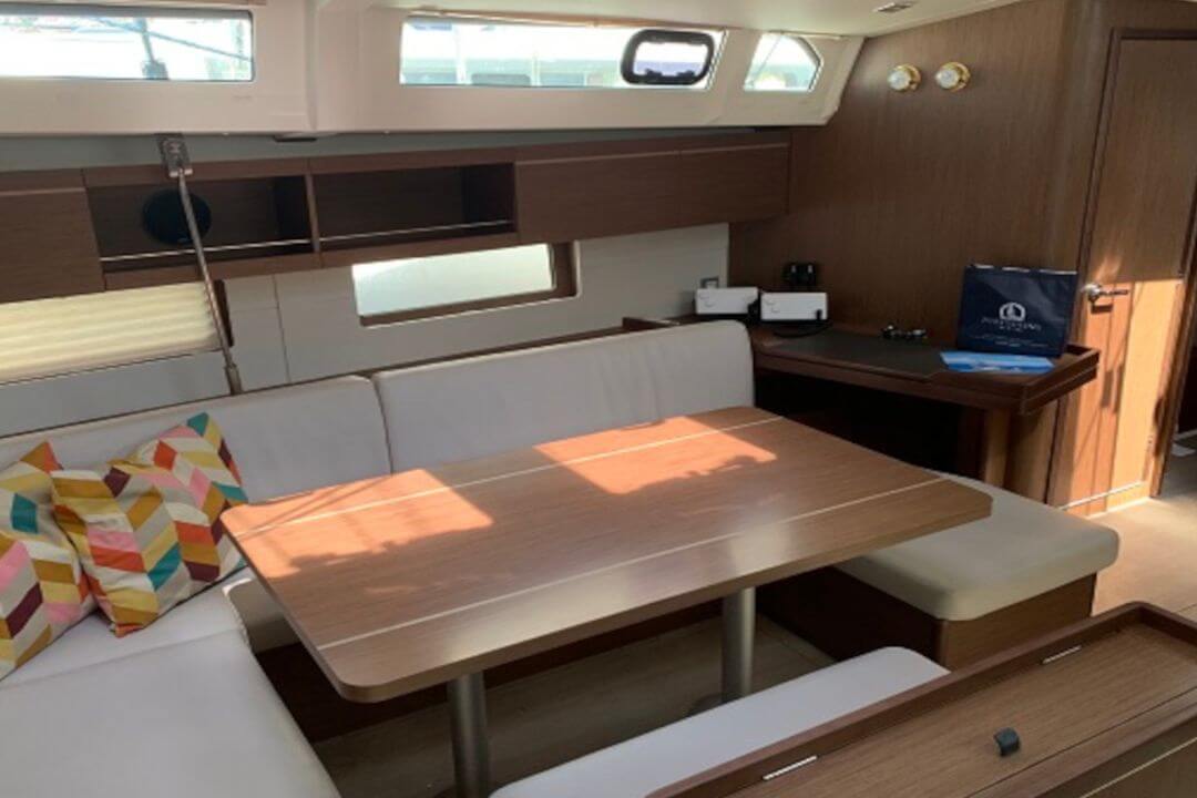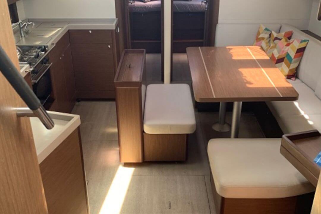 Wnętrze jest jasne, nowoczesne i dobrze zaprojektowane. Mesa z dużym stołem to naturalne centrum życia na jachcie – wspólne śniadania, planowanie trasy czy wieczorne rozmowy po dniu żeglugi.
