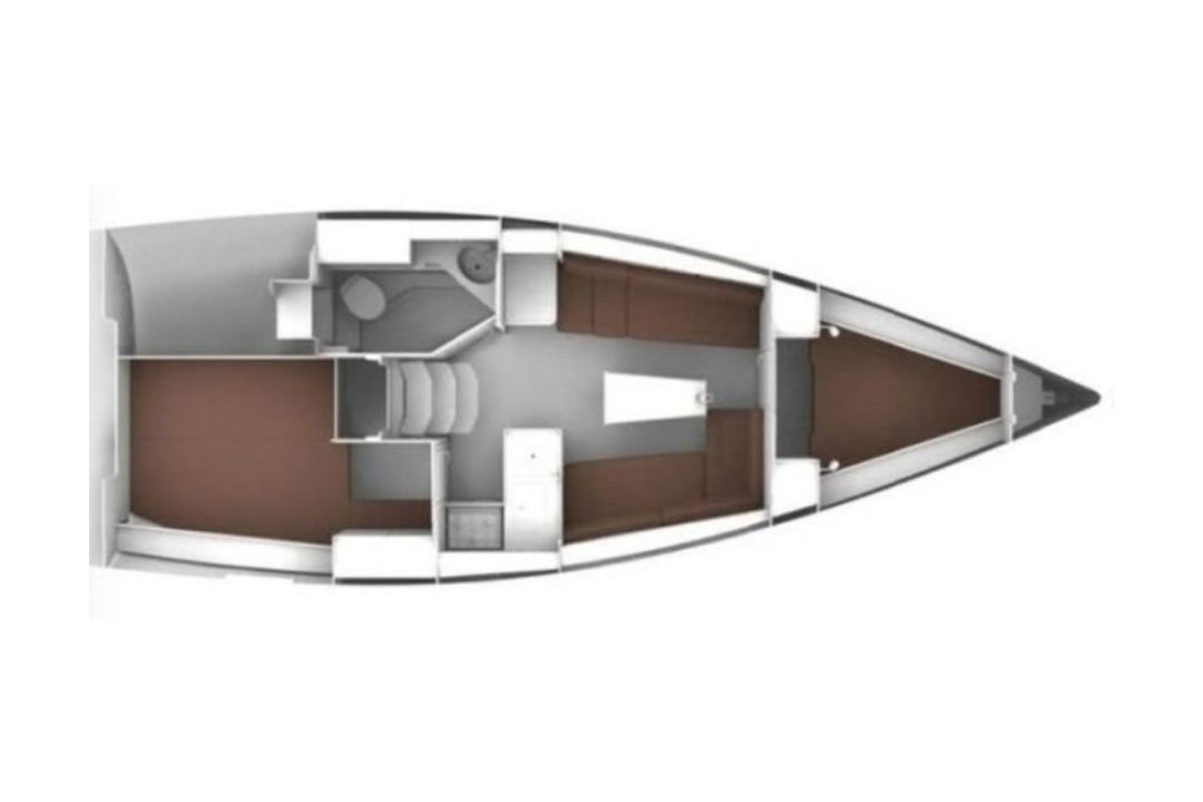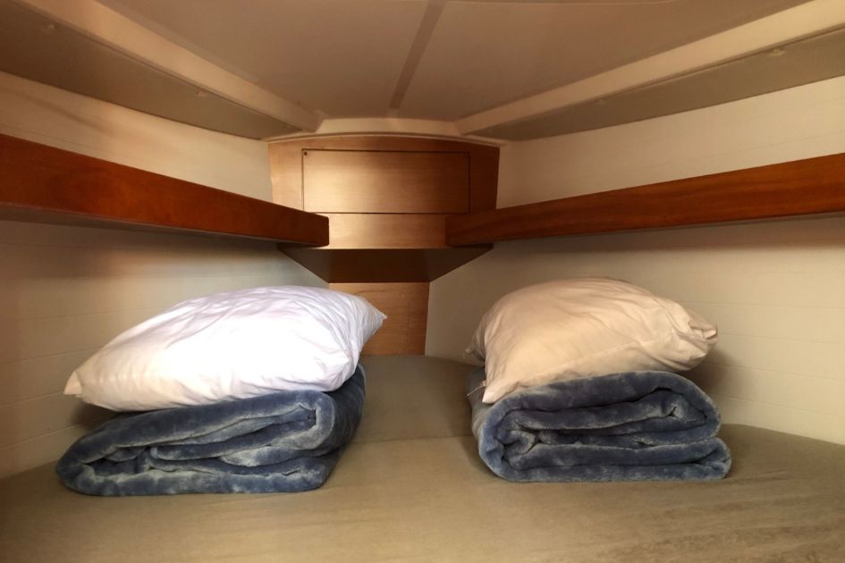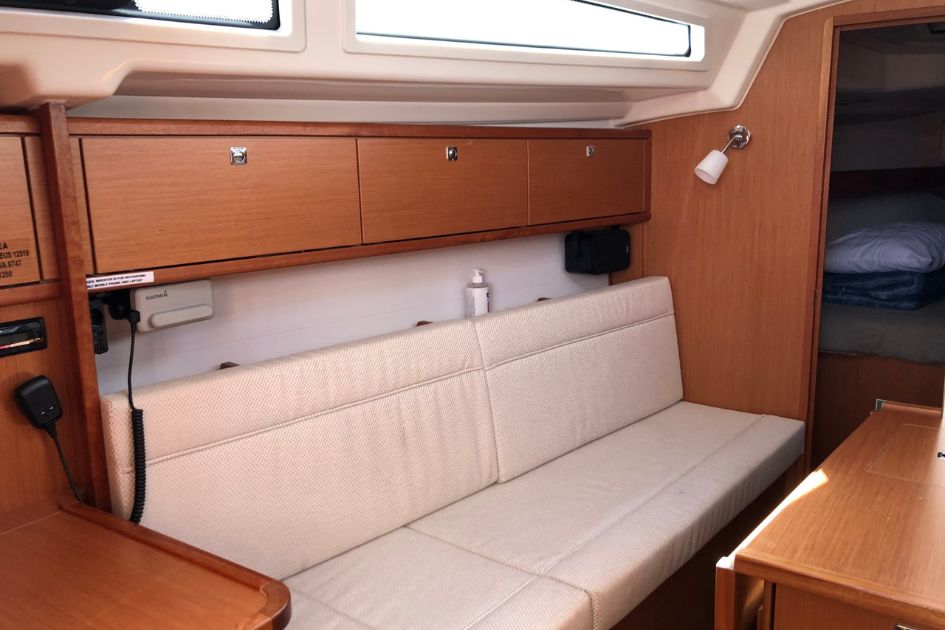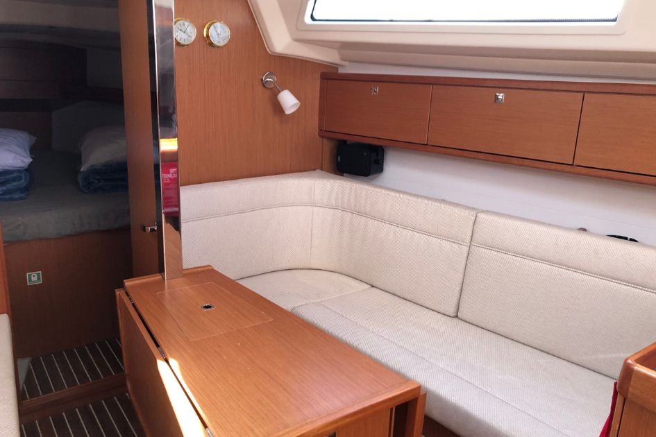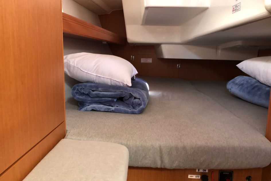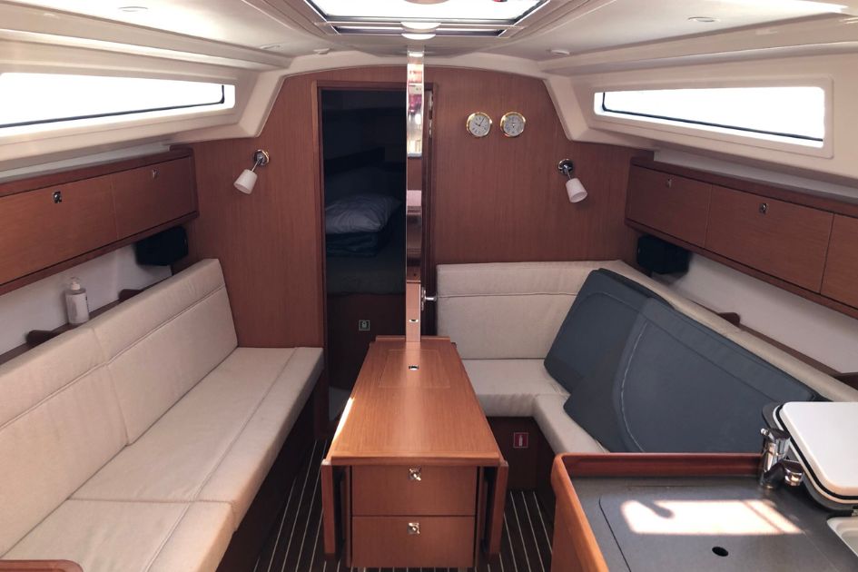 Na pokładzie znajdują się dwie dwuosobowe kabiny oraz dodatkowe miejsca do spania w salonie, co łącznie pozwala na nocleg dla maksymalnie sześciu osób. Wnętrze jest jasne, funkcjonalne i zadbane, a poduszki oraz koce są dostępne dla gości. Do dyspozycji załogi jest jedna łazienka z prysznicem i elektryczną toaletą.