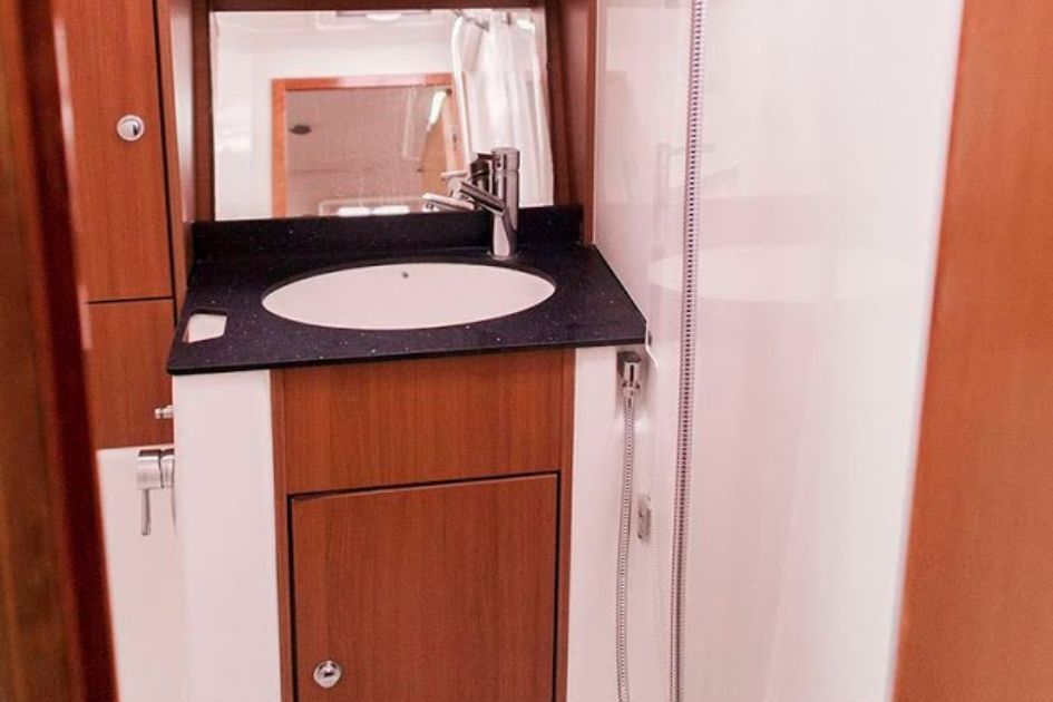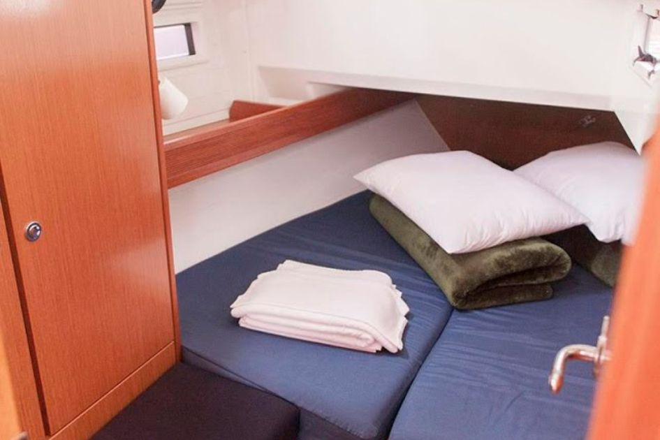 Jacht oferuje trzy kabiny dwuosobowe oraz jedno dodatkowe miejsce do spania w salonie, co pozwala na nocleg dla maksymalnie siedmiu osób. Wnętrze jest funkcjonalne i jasne, a poduszki oraz koce dostępne są na wyposażeniu. Do dyspozycji gości są dwie łazienki z prysznicem i elektrycznymi toaletami, co zapewnia komfort podczas rejsów. W pełni wyposażona kuchnia pozwala wygodnie przygotowywać posiłki na pokładzie.