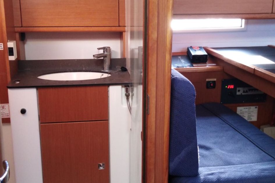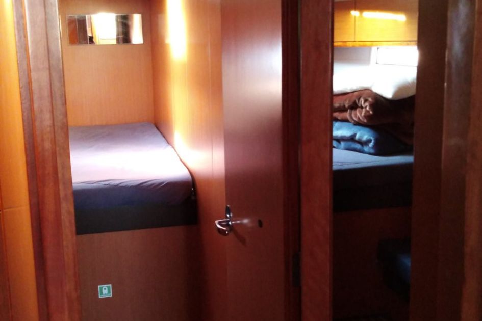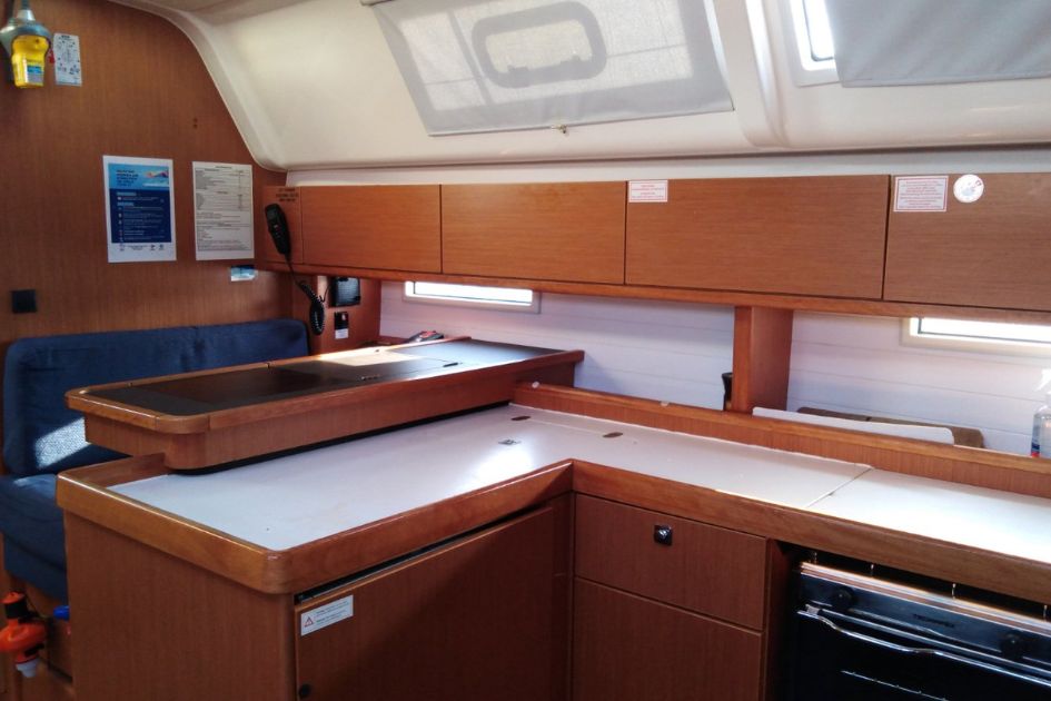 Na pokładzie znajduje się pięć kabin: cztery kabiny dwuosobowe oraz jedna kabina z łóżkiem piętrowym. Dodatkowe dwa miejsca do spania dostępne są w salonie, co łącznie pozwala zakwaterować do dwunastu osób. Wnętrze jest funkcjonalne i dobrze zorganizowane, a kuchnia świetnie wyposażona.