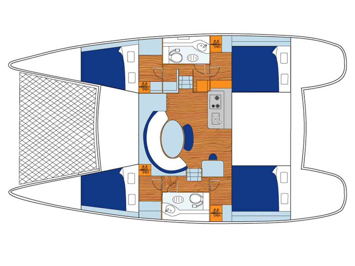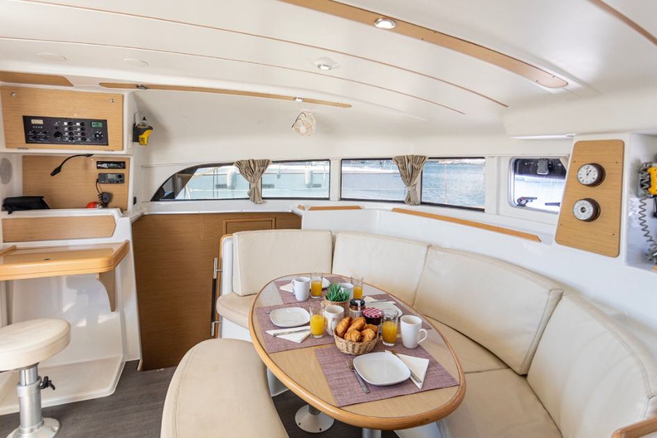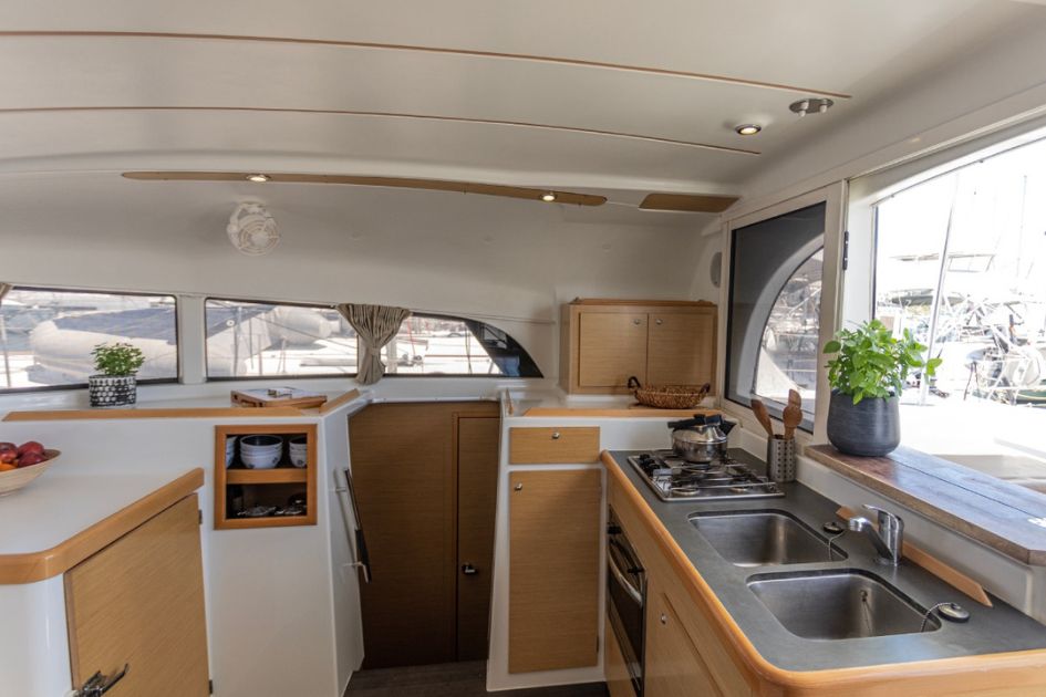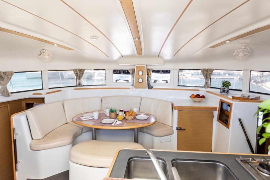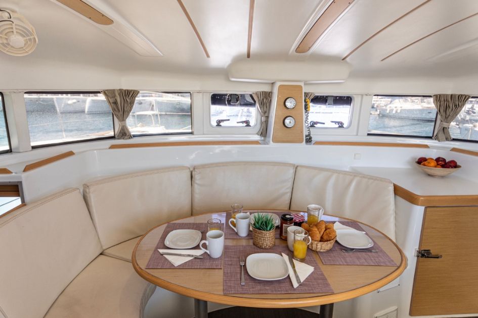 Katamaran ma 11,6 m długości i może pomieścić do 10 osób. Na pokładzie znajdują się cztery dwuosobowe kabiny oraz dodatkowa koja, a także dwie łazienki z prysznicem. Układ wnętrza jest prosty i funkcjonalny, dzięki czemu jacht dobrze sprawdza się zarówno na rodzinne rejsy, jak i wyjazdy z grupą znajomych.