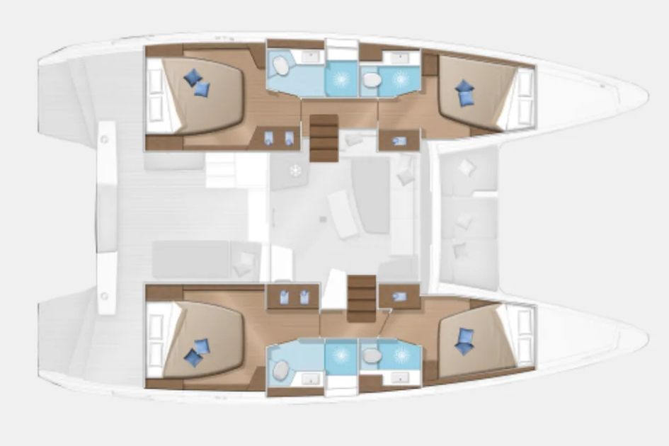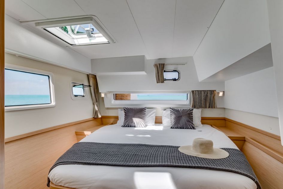 Na pokładzie znajduje się cztery kabiny dwuosobowe oraz dwie dodatkowe kabiny jednoosobowe, co pozwala komfortowo zakwaterować do 12 osób. Każda z głównych kabin posiada własną łazienkę, a dodatkowa toaleta przeznaczona jest dla załogi lub skippera. Wnętrze jest jasne, przestronne i zaprojektowane z myślą o wygodnym życiu na morzu.