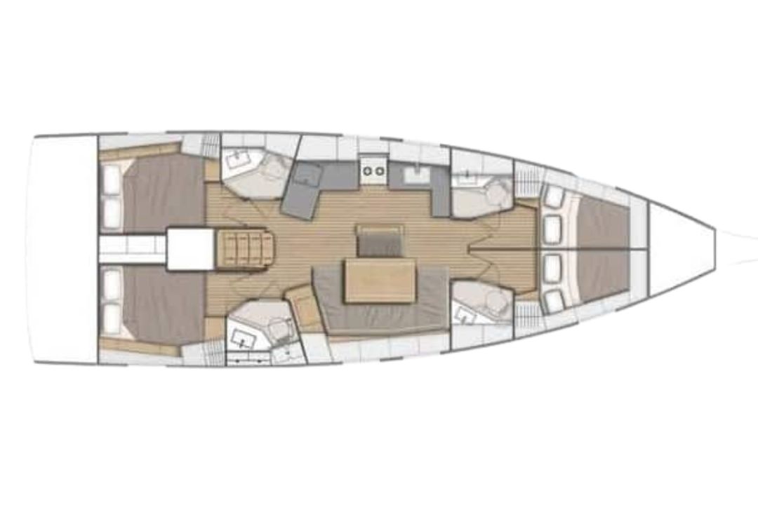 Na pokładzie znajdują się cztery kabiny dwuosobowe oraz dodatkowe miejsce do spania w salonie, co pozwala na nocleg dla maksymalnie dziewięciu osób. Wnętrze jest jasne i funkcjonalne, z dużą mesą oraz kuchnią przystosowaną do codziennego użytkowania podczas rejsu. Rolowany grot i rolowana genua ułatwiają obsługę żagli.