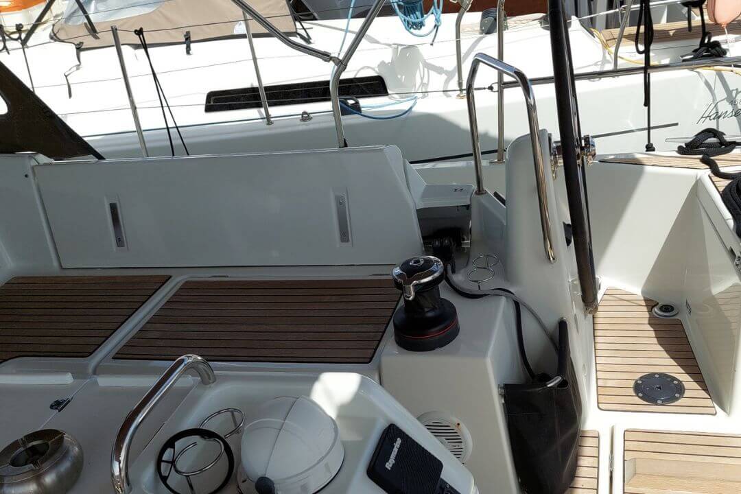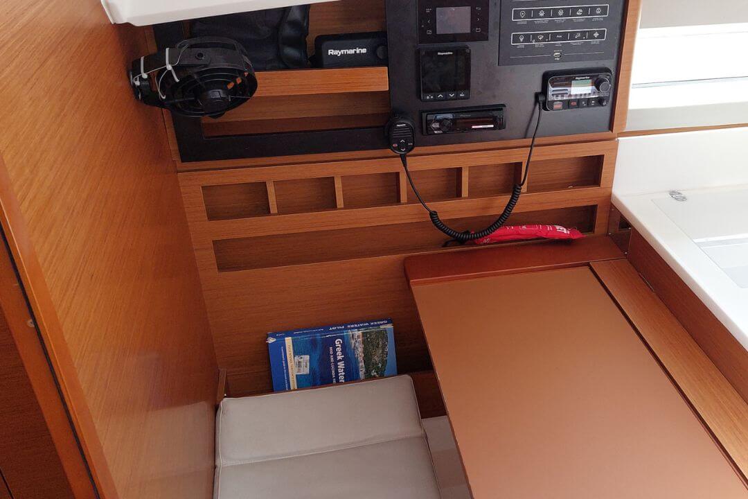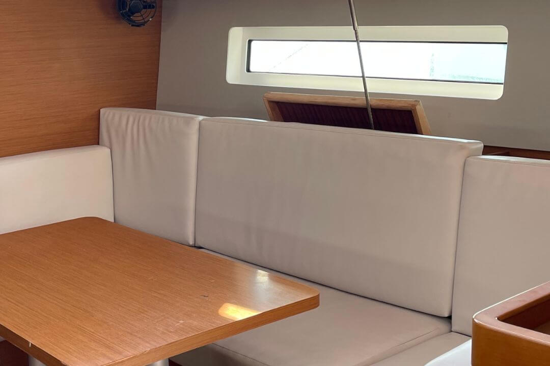 Rolowana genua oraz rolowany grot znacząco upraszczają obsługę żagli – szczególnie przy zmiennych warunkach wiatrowych. Silnik Yanmar 57 KM daje pewność podczas manewrów portowych, a ster strumieniowy dziobowy dodatkowo ułatwia cumowanie rufą. Kokpit jest wygodny i dobrze zorganizowany – idealny na wspólne posiłki i relaks po dniu żeglugi.